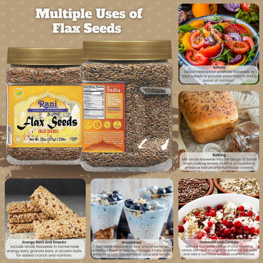 Rani Flax Seeds Whole Raw (Alsi, Linum usitatissimum) 20oz (567g) PET Jar | All Natural ~ Gluten Friendly | NON-GMO | Vegan | Kosher | Product of USA