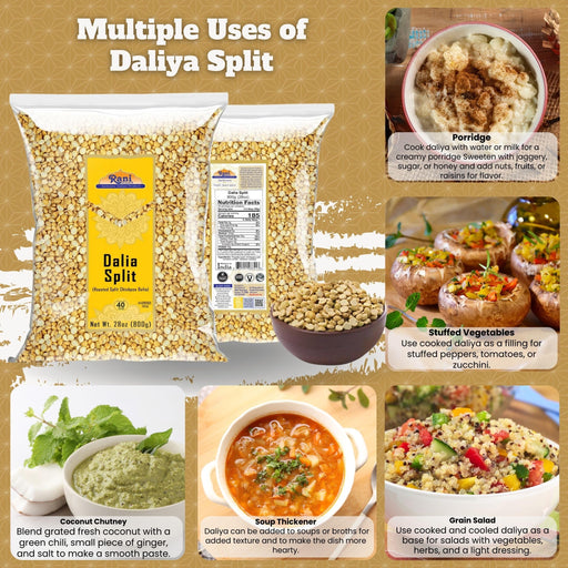 Product Type: Dalia SplitPackaging: Plastic BagNet Wt. 28oz (800g) Product of IndiaIngredients: Roasted Split Chick Peas You'll LOVE our Daliya Sp...