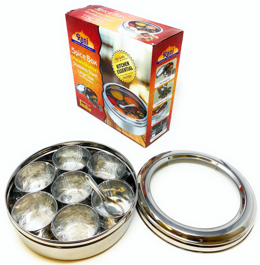 Rani Spice Box Stainless Steel Transparent Round Storage For Spices (Masala Dabba) 7 Compartments, with spoon (9.2in x 3in) ~ Packed in an attractive box, perfect for gifts!